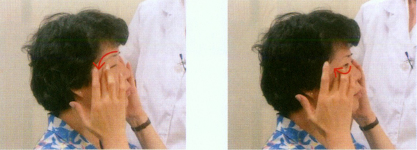 於眼部四周轻抹,由眉心抹向眼尾,然後在眼眶下方抹向眼尾。