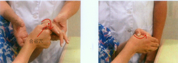 点按合谷穴,两手交替点按及推向食指位置,推至穴位感到微微酸痛便可。