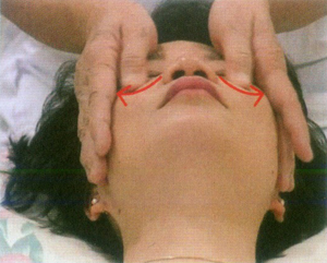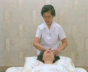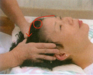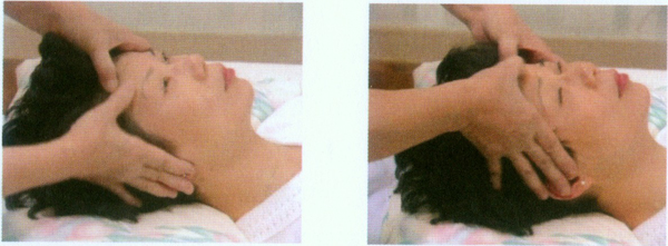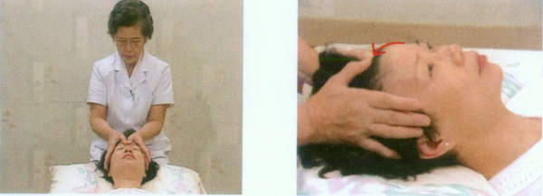 首先双手放在前额,轻轻向上抹2—3下,使病人注意力集中於头部。