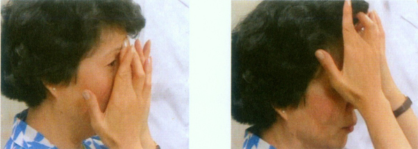 双手中指在左、右眉心用力向上推往额头,重复3~5次。