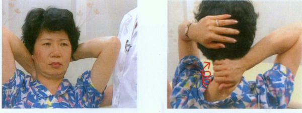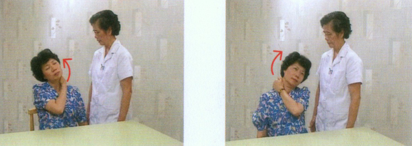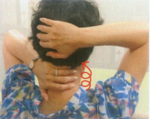 用手拿捏後颈部:一只手放在头枕部,头微向後仰,另一只手放在颈後近发脚位置拿捏,放松肩膊及颈部。然後换手重复动作约5~10次。