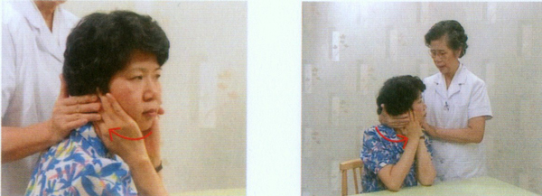 转动颈部:颈部向左右两旁尽力转,手贴两颊随着头转。