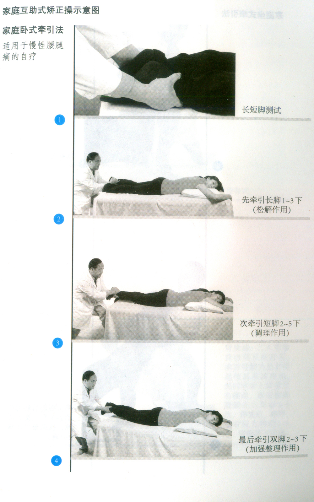 腰骶椎错位的轻症病例,应加强练床上矫形操(见下面家庭互助式矫正操示意图)。
