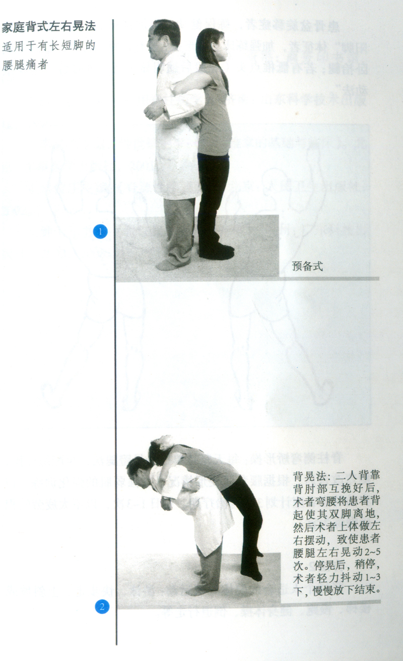 患骨盆旋移症者,练保健功,再加强矫形运动;若有“阴阳脚”体征者,加强练床上矫形操;若有歪臀跛行者,加强练侧卧抬腿;若有骶椎点头(屁股后翘明显)者,加强练“抱膝滚动法”。