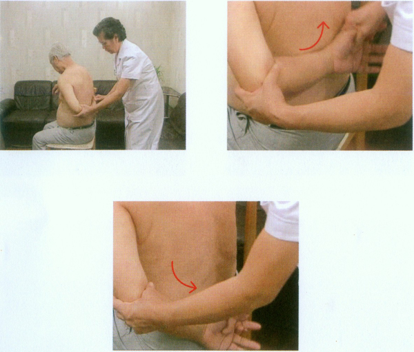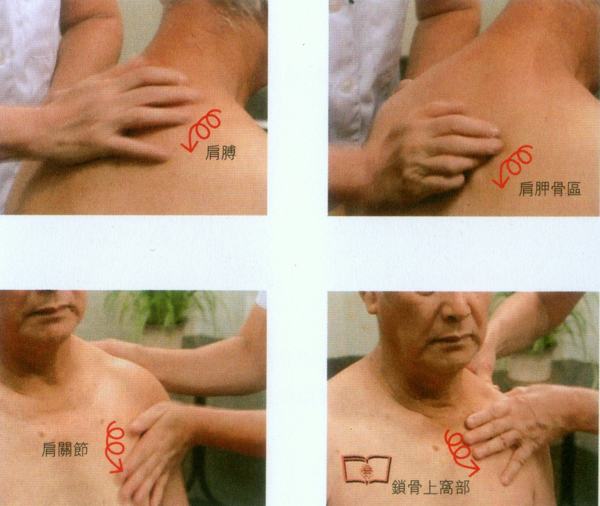 1.在肩膊及颈部做掌揉法,包括整个肩胛骨区及肩关节周围,并由下颈部揉按至屑部约3分钟。