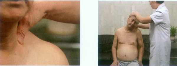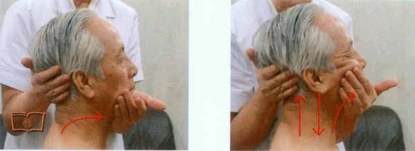 3.用手托起下颌及後枕部位,轻轻把头作屈伸活动,让病人放松及分散注意力。在放松情况下,把头向上牵提,再慢慢放下, 重复牵提动作3—5次。