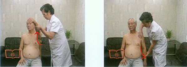 2.两人需要配合动作。先在锁骨上方用拇指轻轻按压,寻找又硬又实的位置,用拇指轻力扶着。病者侧头及缩起肩膊用力夹向术者的手,此时术者用拇指大力向裹面按压,然後放松;重复1次。