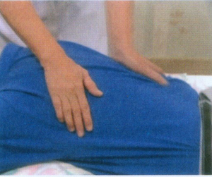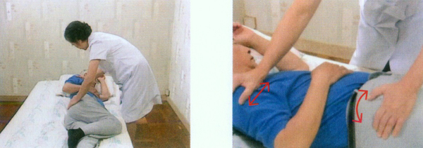 病人侧卧,上方手及脚屈曲摆放。双手分别按着臀部及肩部,前後摇动约5—6下,然後转身重复动作。