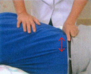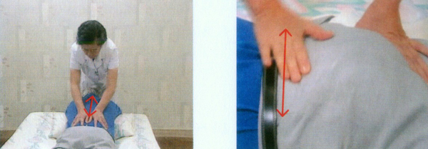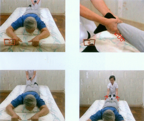 病人俯伏及抓紧床边。提起其中一边脚踝,一边向下牵拉一边抖动,再用力牵拉一下;在另一只脚重复动作。完成後提起双脚用力拉两下。若病人两脚不等长,牵拉长脚1~2下,牵拉短脚2~5下,最後双脚齐拉2~3下。